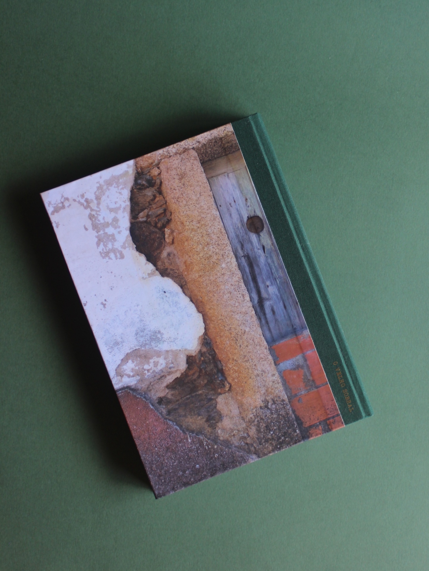 • Livro capa dura com imagem de parede velha e lombada verde com texto