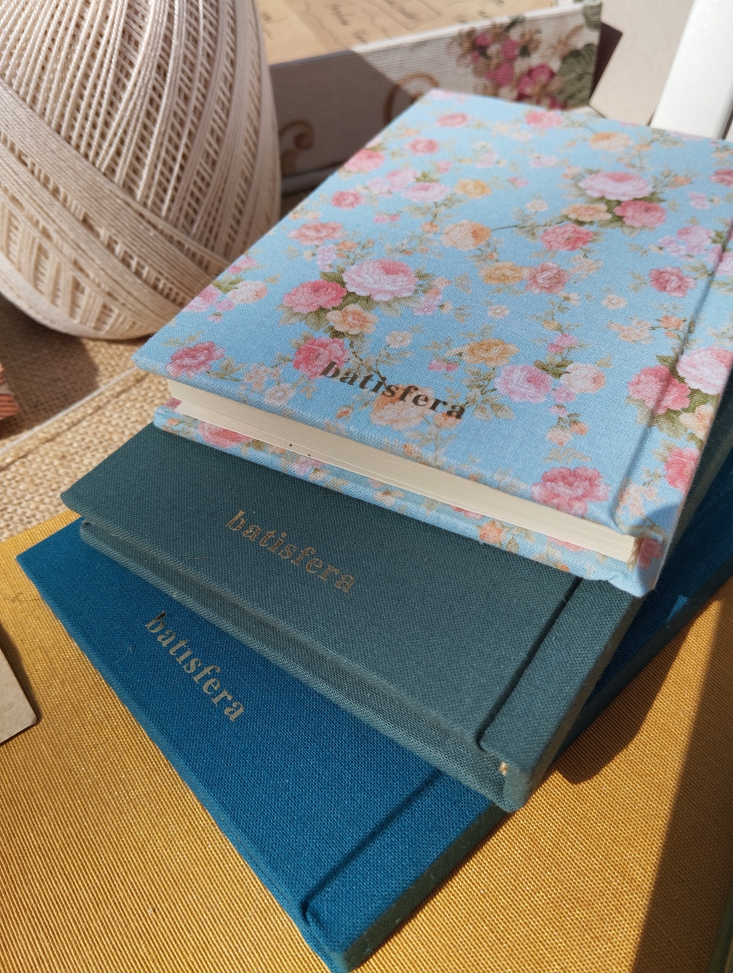 • Três cadernos com capas de tecido em diferentes tons de azul e a palavra 'baustera' impressa, sobre superfície amarela junto a novelo de linha.