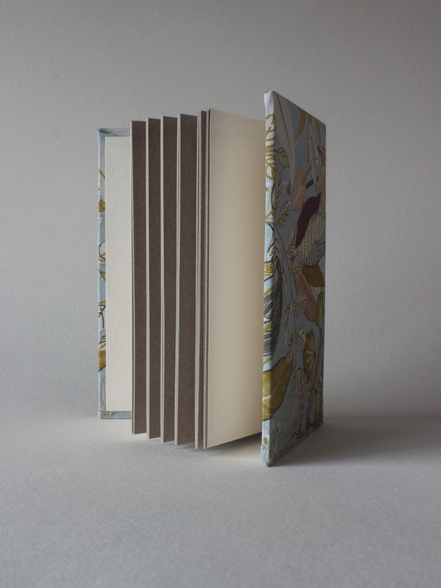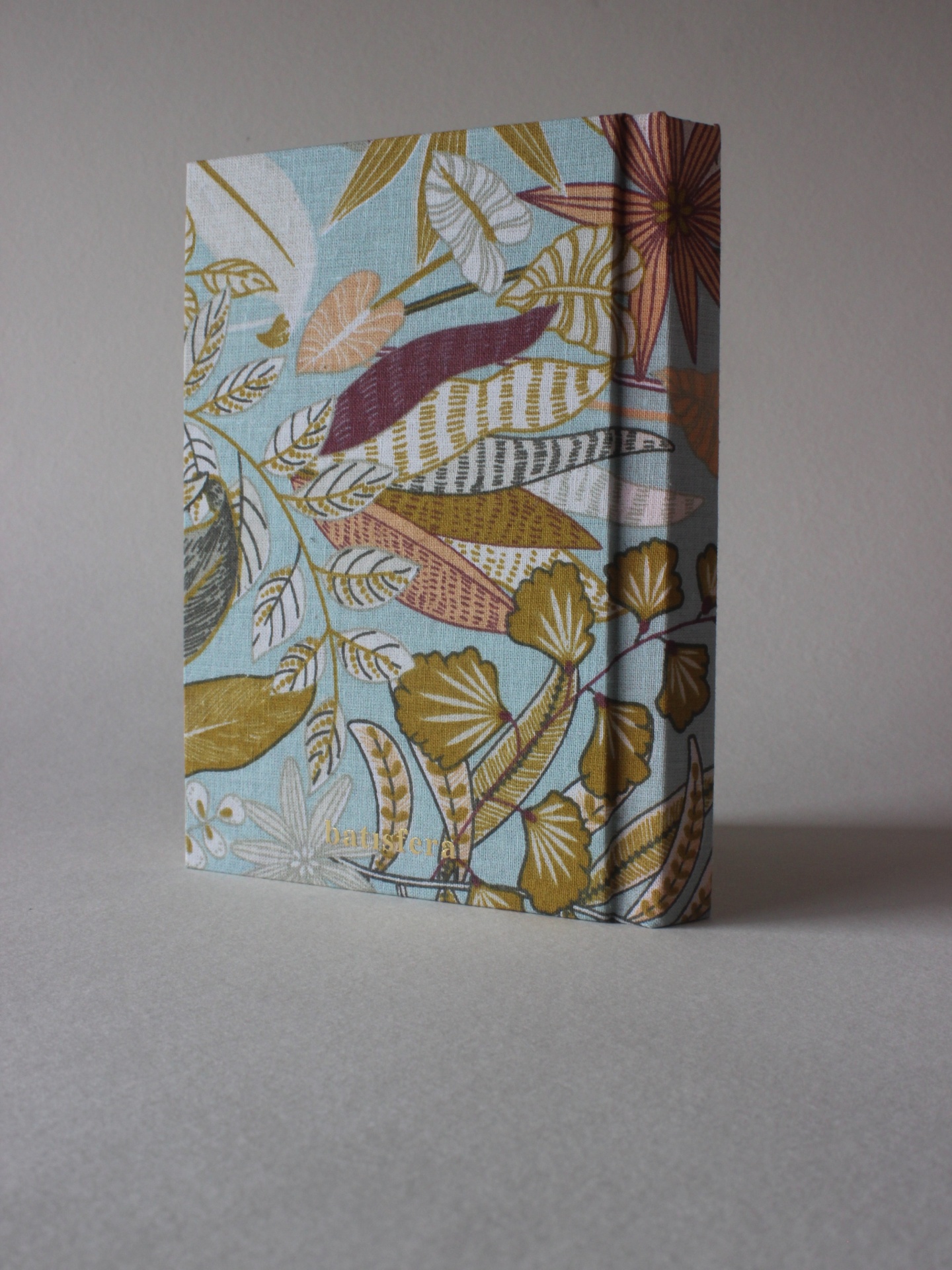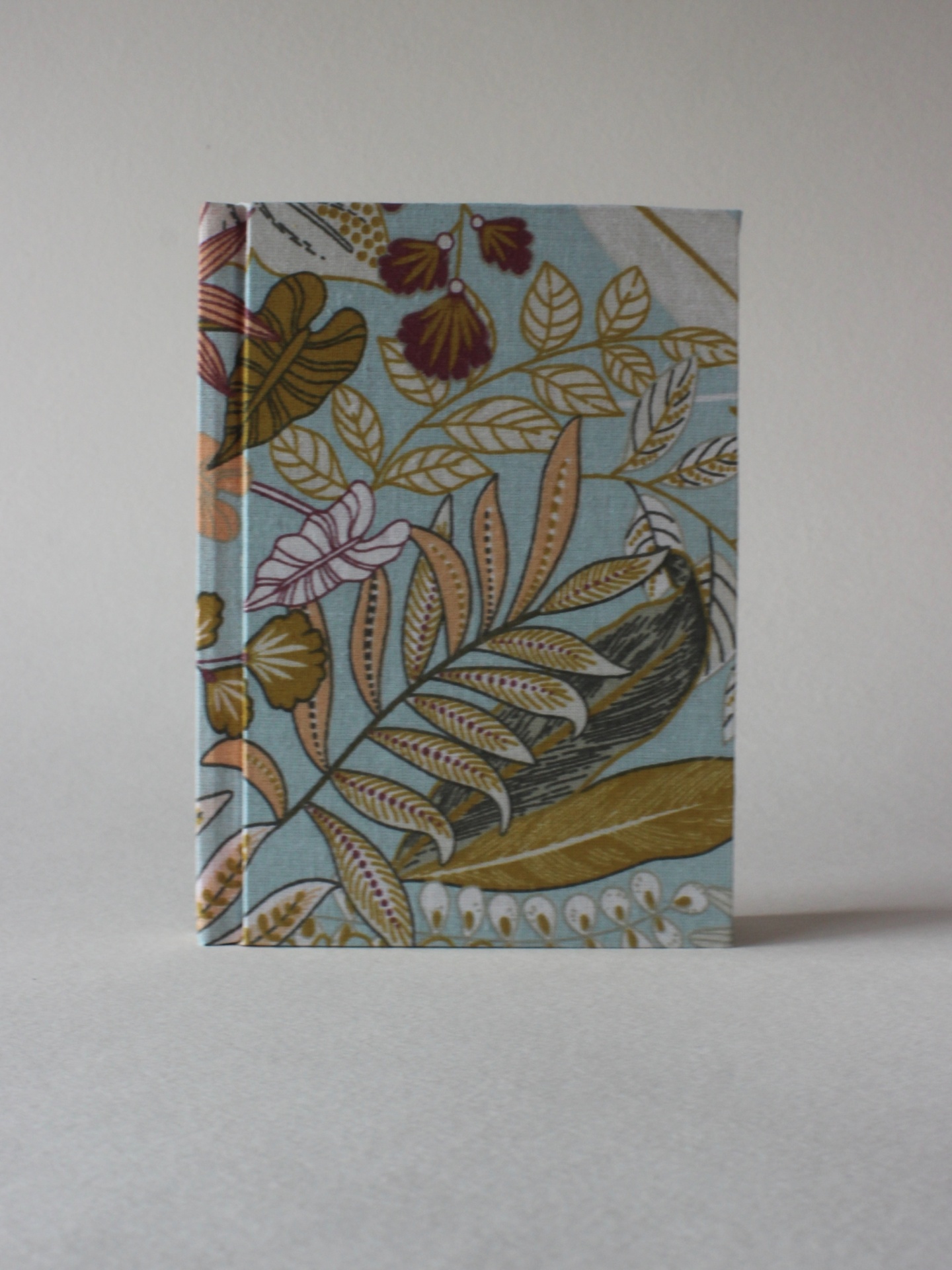 Capa de livro com tecido floral em tons pastel e padrão de folhas